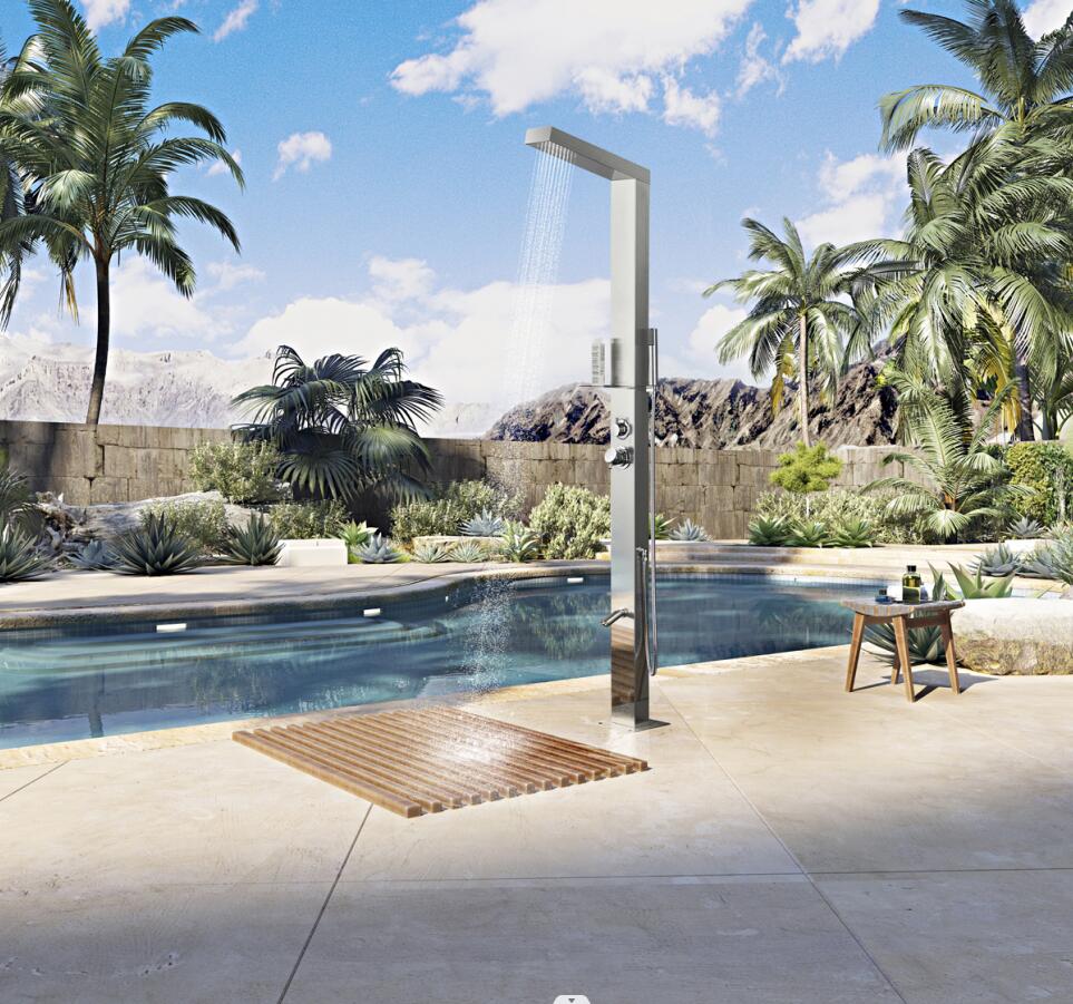 Outdoor Shower : S311 is constructed with 316 Marine Grade Stainless Steel for durability,This product has an integrated a generously rainfall showerhead plus a hand sprayer and a firm convenient shampoo shelf ,a foot wash.It features a beautiful design and Contemporary amenities. you can position this outdoor shower in any location accessible to a hot and cold water supply. That is perfect to rinse off with after playing in the yard or taking a dip in the pool.If you really love the style and had hi expectation of quality,choose it!